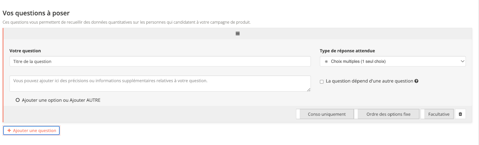 Vous pouvez également ajouter des questions (obligatoires ou facultatives), notamment si vous avez besoin de plus d’informations sur les candidats, si vous prévoyez de leur remettre des cadeaux ou produits (centres d’intérêts, goûts, habitudes de consommation, etc) ou si des ateliers sont prévus.