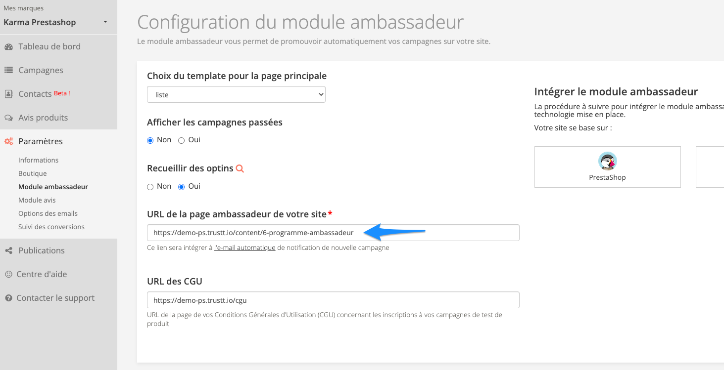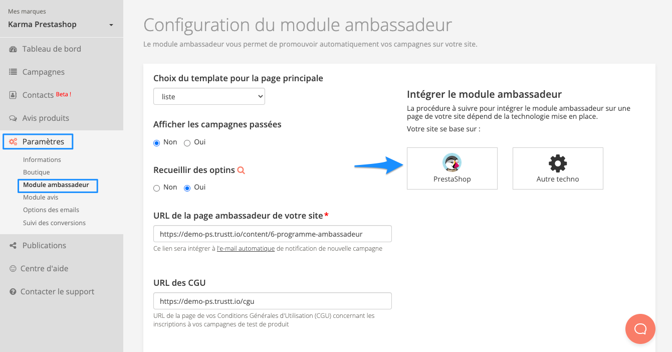 Dans le logiciel Trustt,  allez dans le menu latéral à gauche, cliquez sur  Paramètres et Module Ambassadeur. Dans la page de configuration du module ambassadeur, cliquez sur Prestashop.