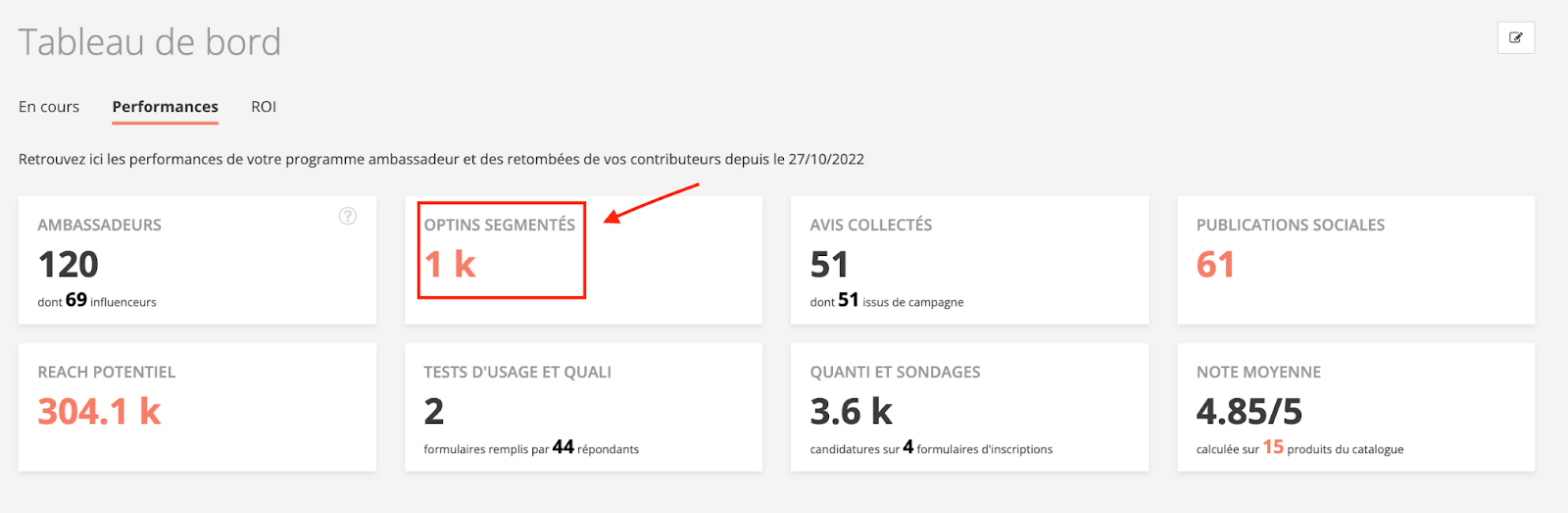Autre possibilité pour récupérer vos optins : rendez-vous dans l’onglet “tableau de bord” de votre marque, puis cliquez sur “performances” et “optins segmentés”
