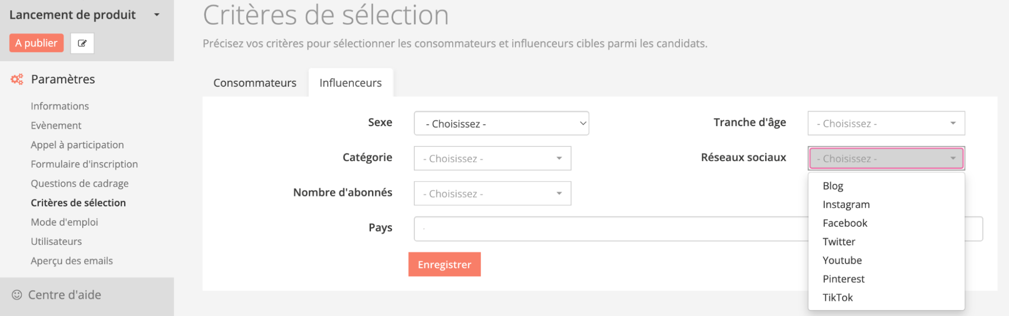 Pour cela, rendez-vous dans “ paramètres” puis dans “critères de sélection” et dans l’onglet “influenceurs”. C’est ici que vous choisissez “Tik Tok” dans le menu déroulant des réseaux sociaux.