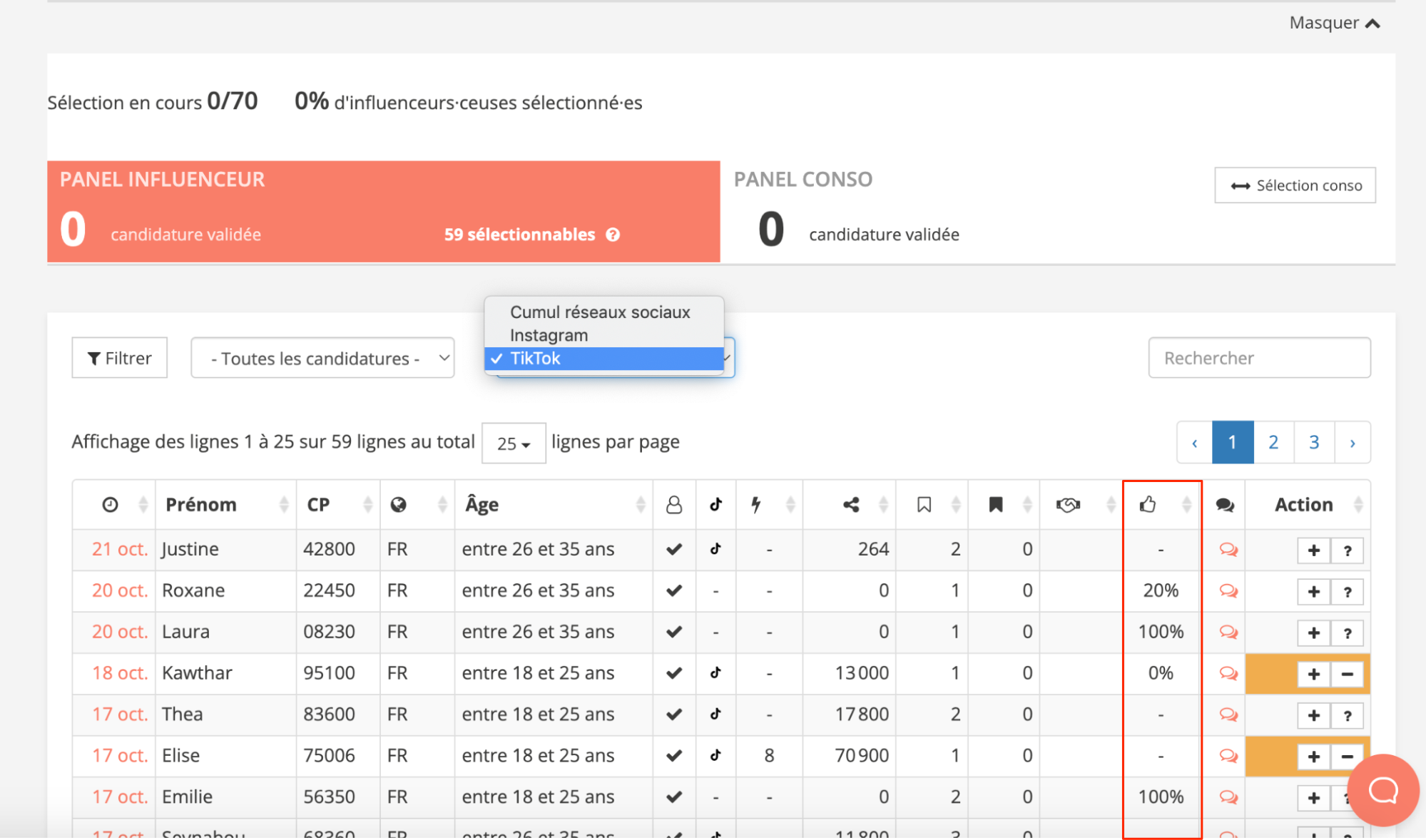 Dans la sélection du panel, dans le menu déroulant des réseaux sociaux, sélectionnez “TikTok” pour n’afficher que les personnes qui ont renseigné leur compte TikTok.
