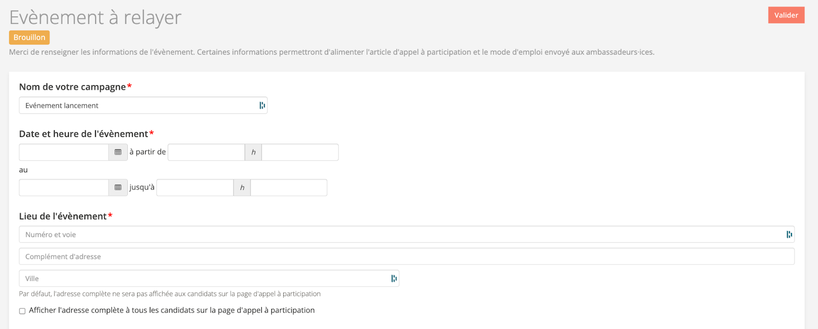 Vous pouvez ensuite valider les informations de l'événement à relayer, en cliquant en bas à droite sur “valider l’événement”, avant de passer à l'étape suivante, Etape 3 : Formulaire d’inscription.