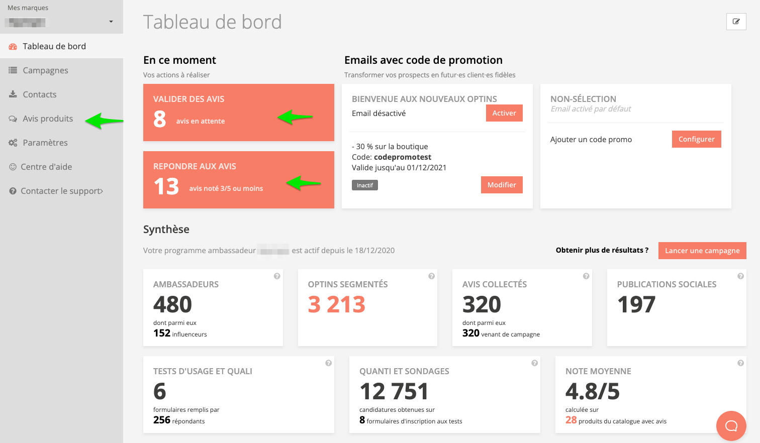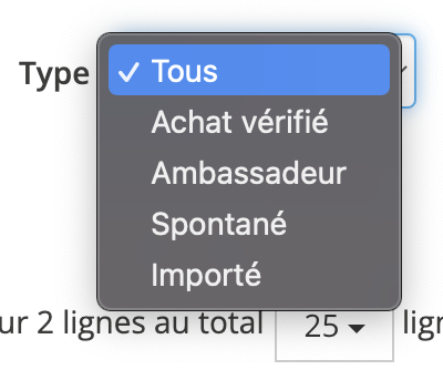 - Ambassadeur : ce sont les avis que vous avez récupérés via les campagnes ambassadeur.