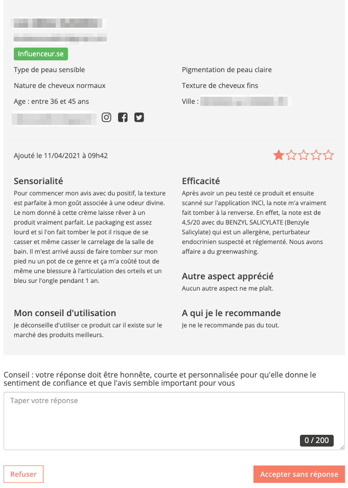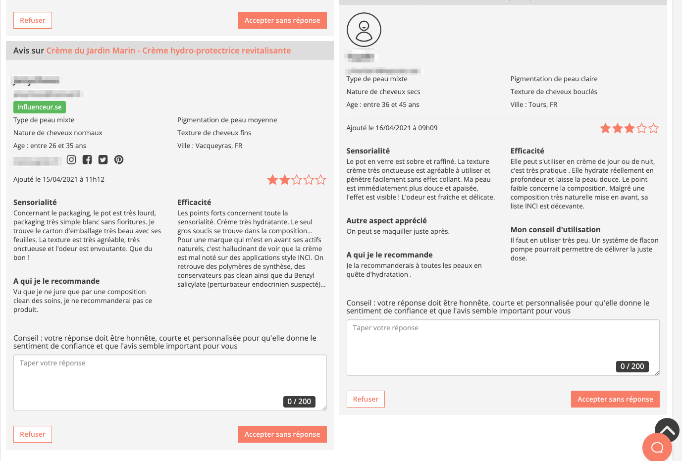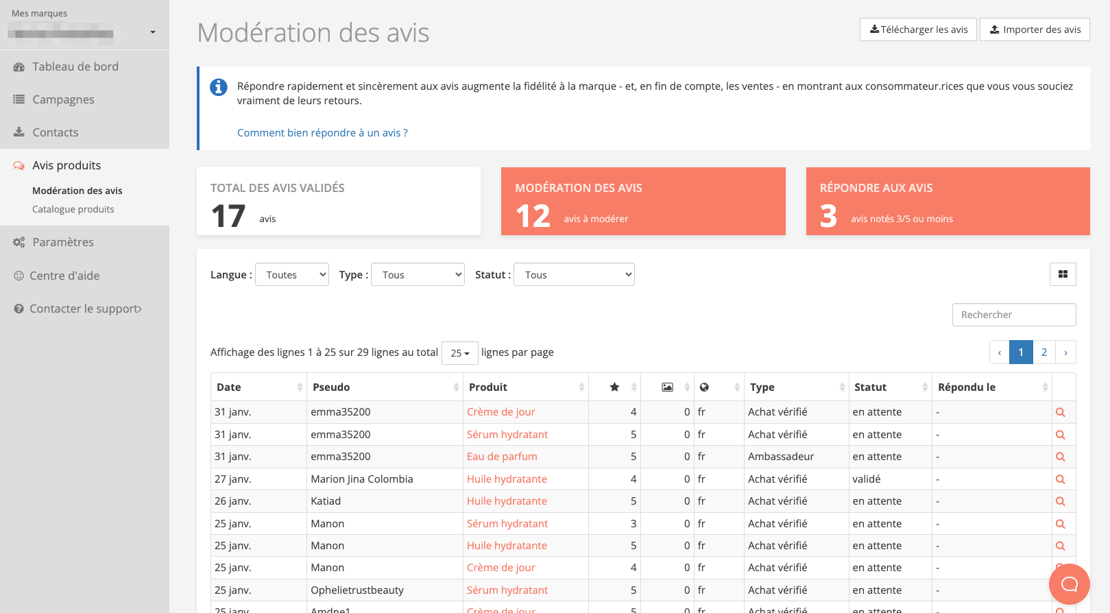 Modérer vos avis vous permet d'accepter ou de refuser les avis qui ont été écrits sur vos produits ; issus de campagnes ambassadeurs ou d'avis spontanément déposés sur votre site e-commerce.