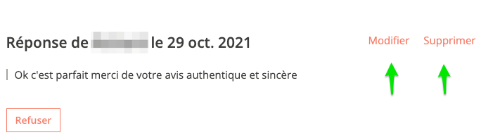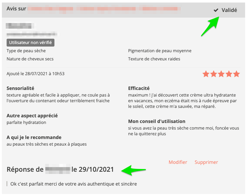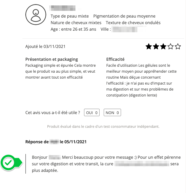 Une fois l'avis validé, la réponse est instantanément publiée avec l'avis sur votre fiche produit correspondante.