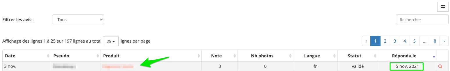 Pour visualiser votre réponse en ligne, cliquez sur le lien du produit, sur la ligne de l'avis correspondant dans le listing de vos avis.
