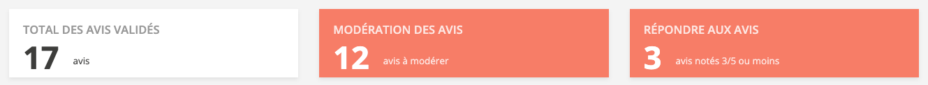 - Modération des avis : c'est le nombre d'avis que vous devez valider ou refuser. Ce bloc est cliquable et vous permet d'afficher directement les avis à modérer.