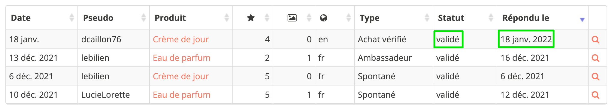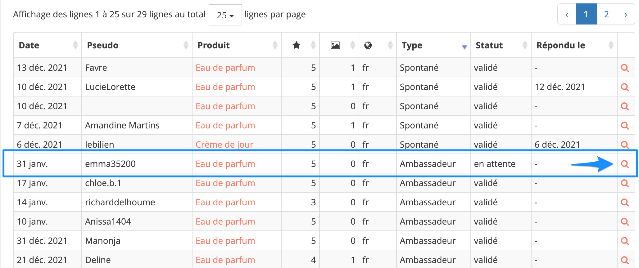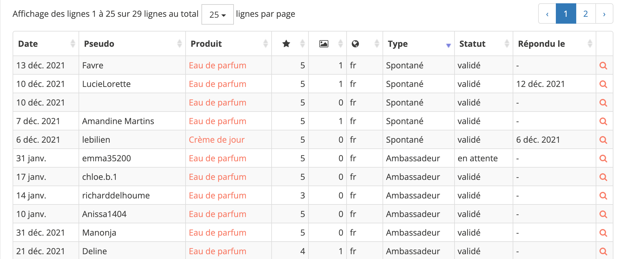 Cette page vous affiche la totalité des avis que vous avez récupéré lors de vos campagnes ambassadeurs ainsi que les avis reçus spontanément de la part de vos client.es depuis votre site e-commerce.