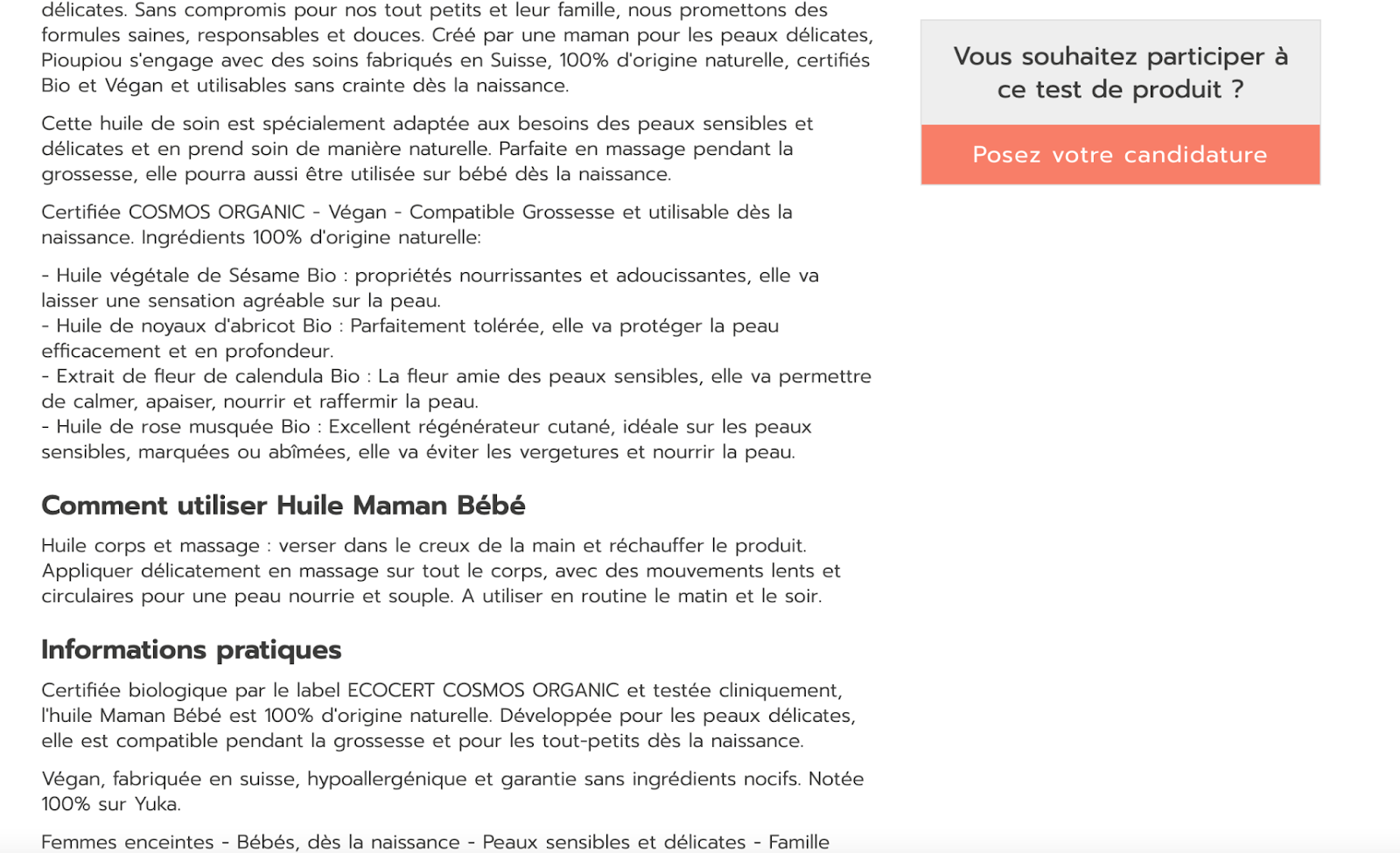 • Les informations pratiques : les particularités du produit (photosensibilisant, made in France, packaging recyclable…), la contenance, le prix…