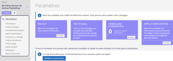 Publiez la campagne quand vous avez rempli toutes les sections du paramétrage (voir section "Paramétrer la campagne).
