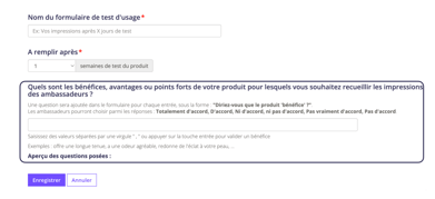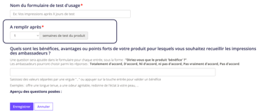 Pour ce qui est du champ "À remplir après", cela dépend du temps nécessaire pour tester votre produit. Vous pouvez envoyer au maximum un test d'usage par semaine.