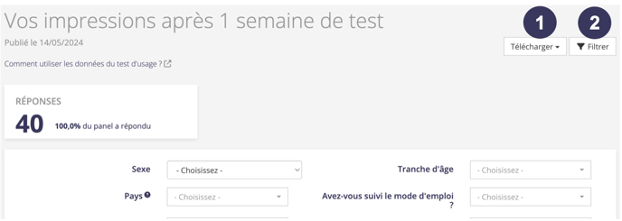 Finalement, vous pouvez filtrer les réponses au test pour une typologie de répondants (1) et télécharger les réponses dans un fichier .xls (2).