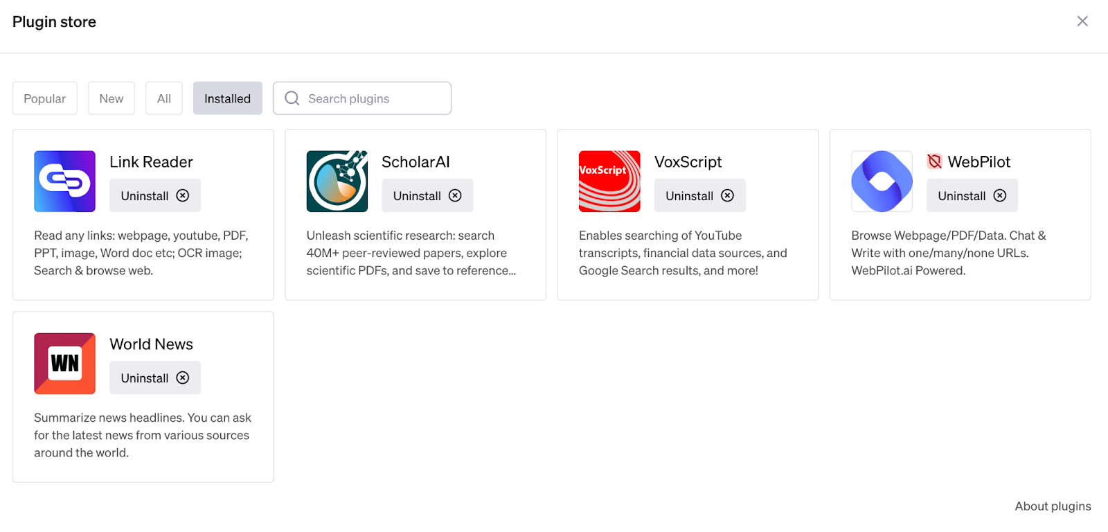 Pour cela, cliquez sur “Settings” en bas à gauche, puis “Beta features”, et activez les Plugins. Ensuite, dans un nouveau chat, avec GPT4, il suffit de se rendre sur le plugin store pour choisir les plugins de votre choix, dont WebPilot.