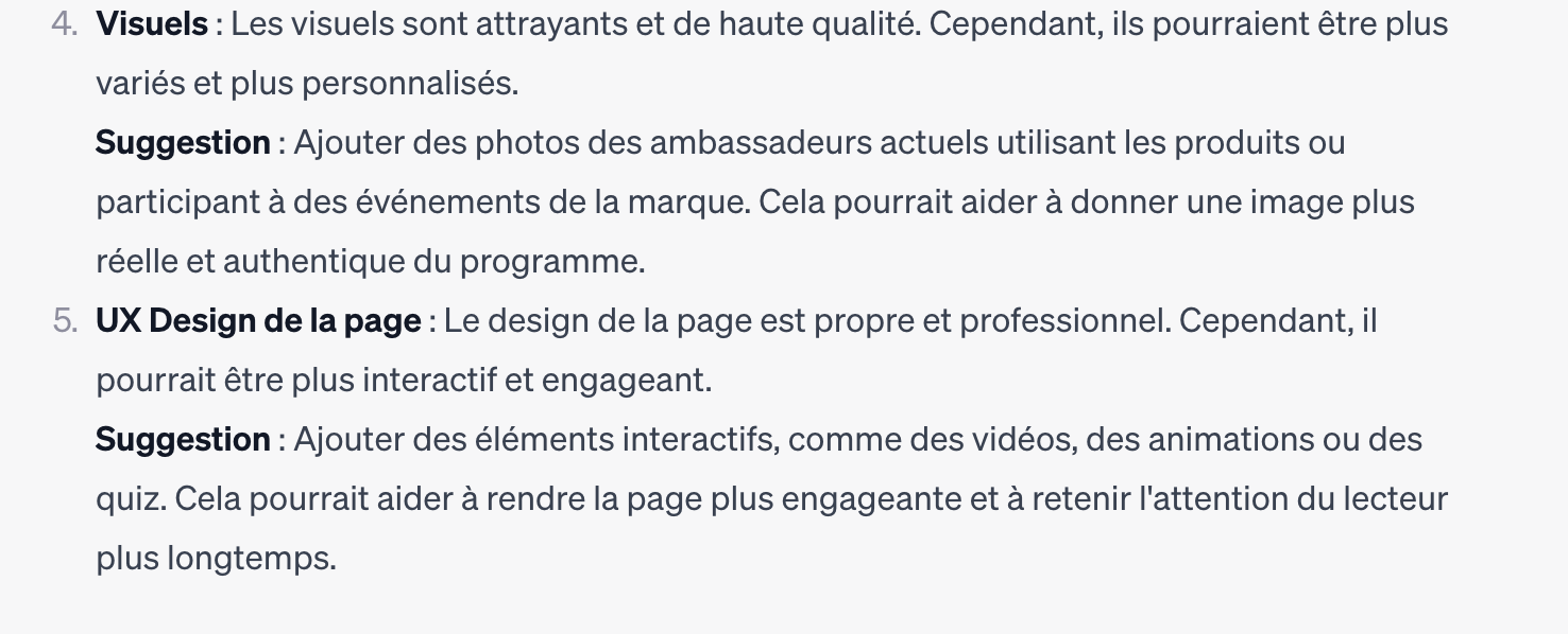 Il n’est pas toujours évident de savoir si les mots sont les plus justes ou si les tournures de phrases sont les plus engageantes. En utilisant intelligemment ChatGPT, vous pouvez également obtenir une analyse (et des solutions) pour améliorer certains de vos contenus : notamment votre page Programme Ambassadeur !