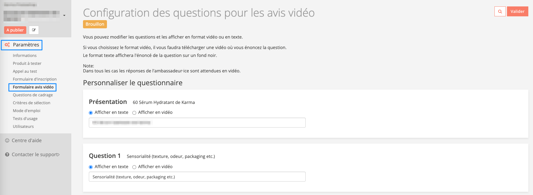Sélectionnez la campagne où l'option des avis vidéos est activée et cliquez sur "Paramètres" dans le menu latéral à gauche puis dans "Formulaire avis vidéo".