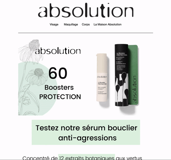 Exemple de la marque Absolution qui met en avant une campagne de test de produit via un email à ses abonnés :