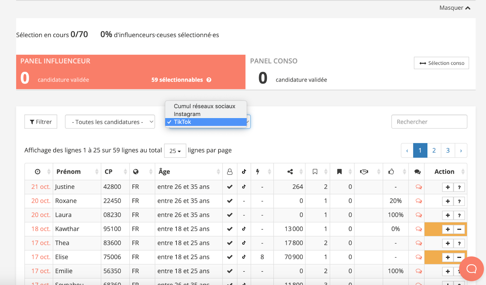 Il est possible de filtrer les statistiques des campagnes avec les tops influenceurs (en regardant le taux d’engagement) : cela permet du coup de repérer les meilleurs influenceurs et de les sélectionner lors des prochaines campagnes.