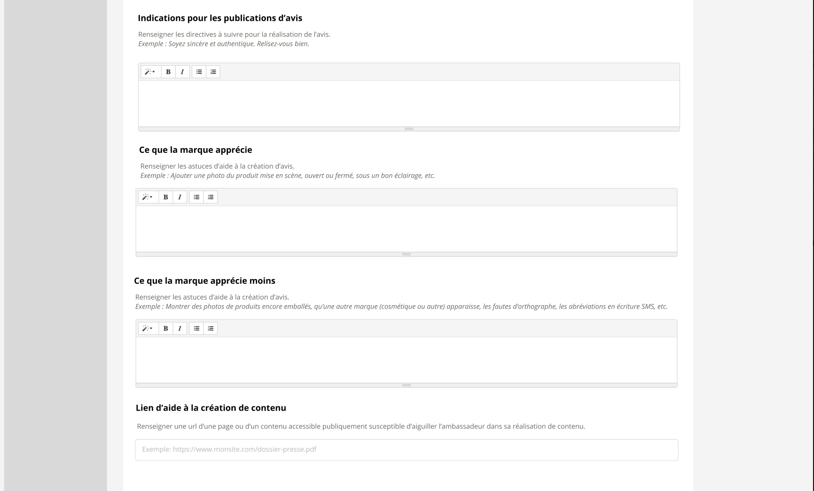 La partie “ce que la marque adore” et “ce que la marque n’aime pas” permet de donner des indications aux ambassadeurs sans les obliger. Cela peut être “vous voir avec le produit, un cadre de salle de bain, un bon éclairage ou une vidéo du produit seul, une vidéo sombre, des bruits parasites, une vidéo qui bouge…”