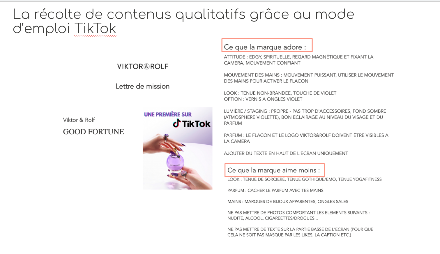 - Noter les do et les don’t de votre marque, cela permet d’éviter que les ambassadeurs fassent un contenu qui ne convienne pas ou qui ne soit pas représentatif de vos valeurs,