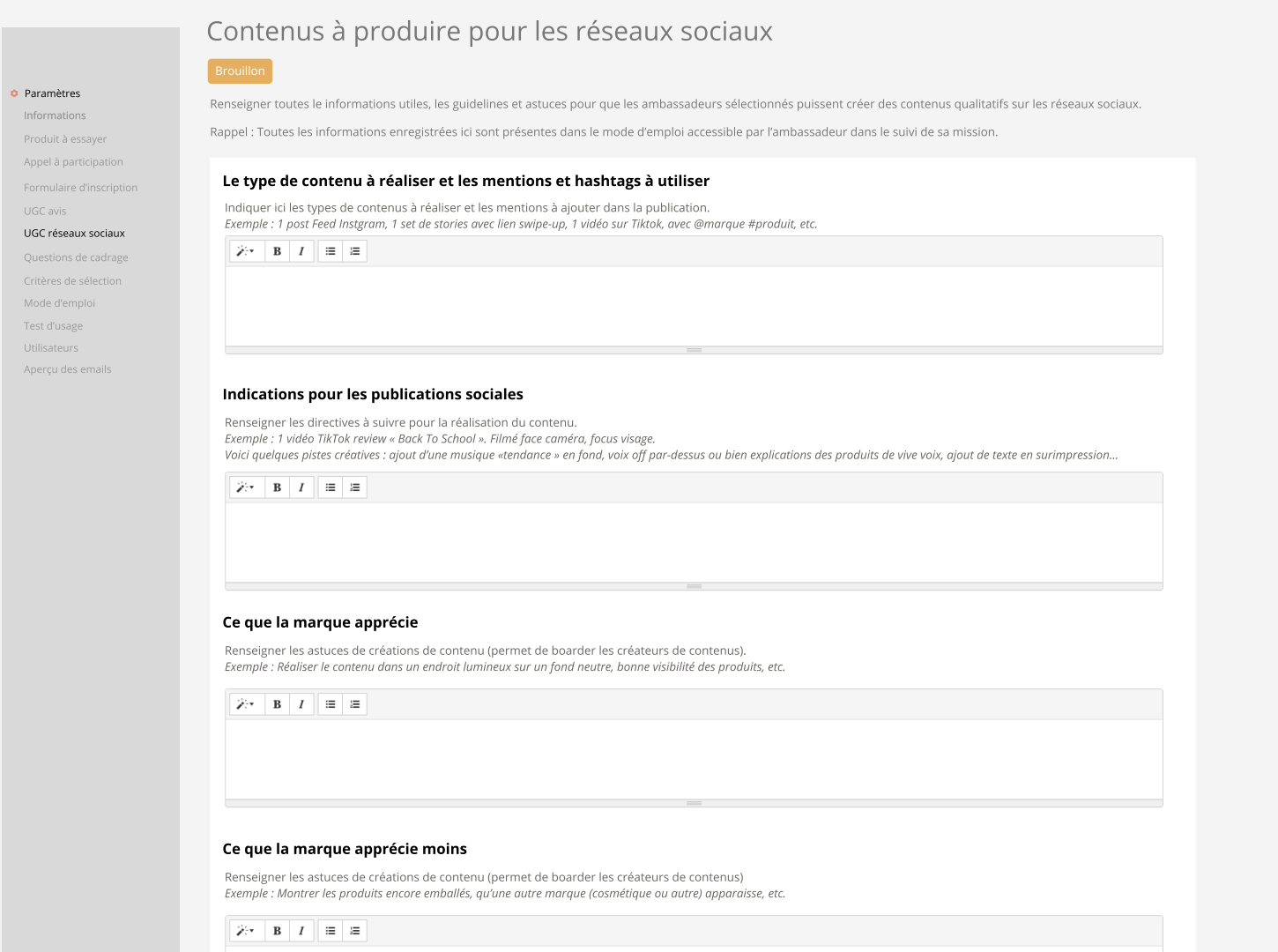 RDV dans : “paramètres de votre campagne”, puis “UGC Réseaux Sociaux”, et remplissez les différents champs en essayant d’être le plus précis possible tout en laissant une marge de liberté à l’ambassadeur pour que les contenus restent créatifs.