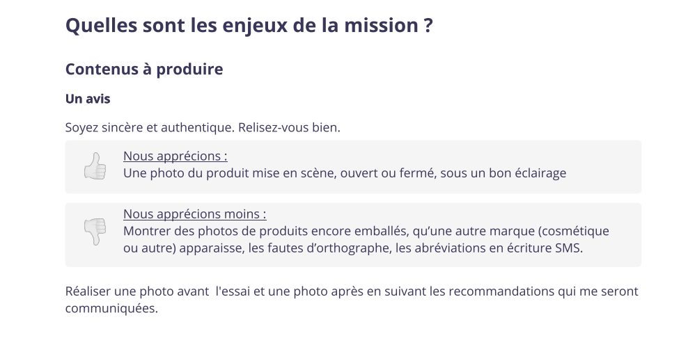 - Accompagner l’influenceur en partageant une lettre de mission enrichie avec des indications précises,