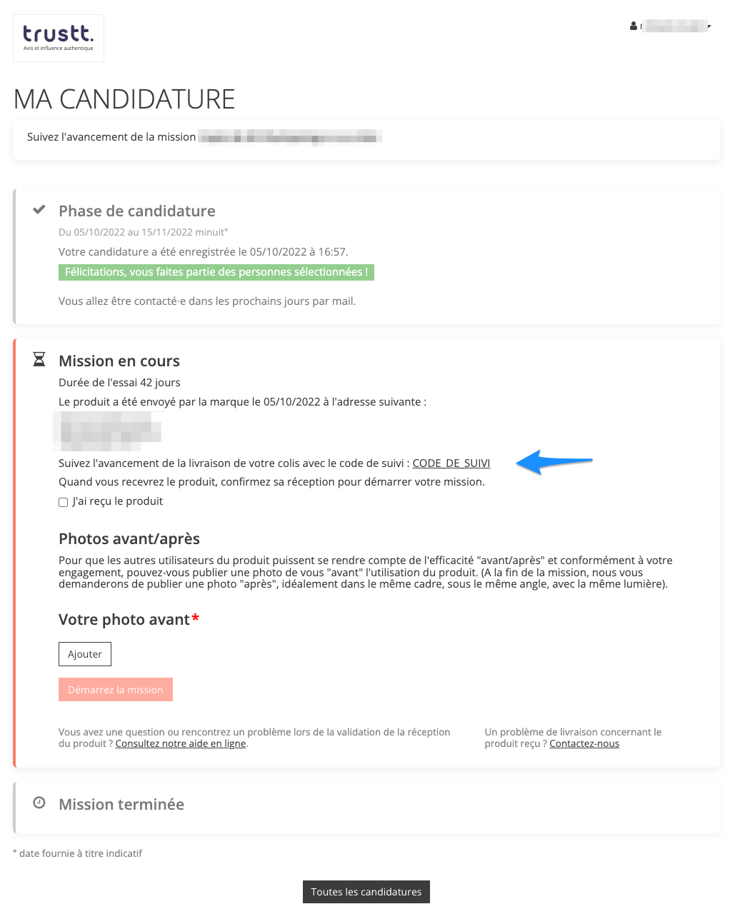 Si vous disposez d'un code de suivi de colis, vous pouvez le renseigner pour chaque envoi. Un lien cliquable de suivi de colis sera affiché dans le suivi de candidature dans l'espace personnel de l'ambassadeur.