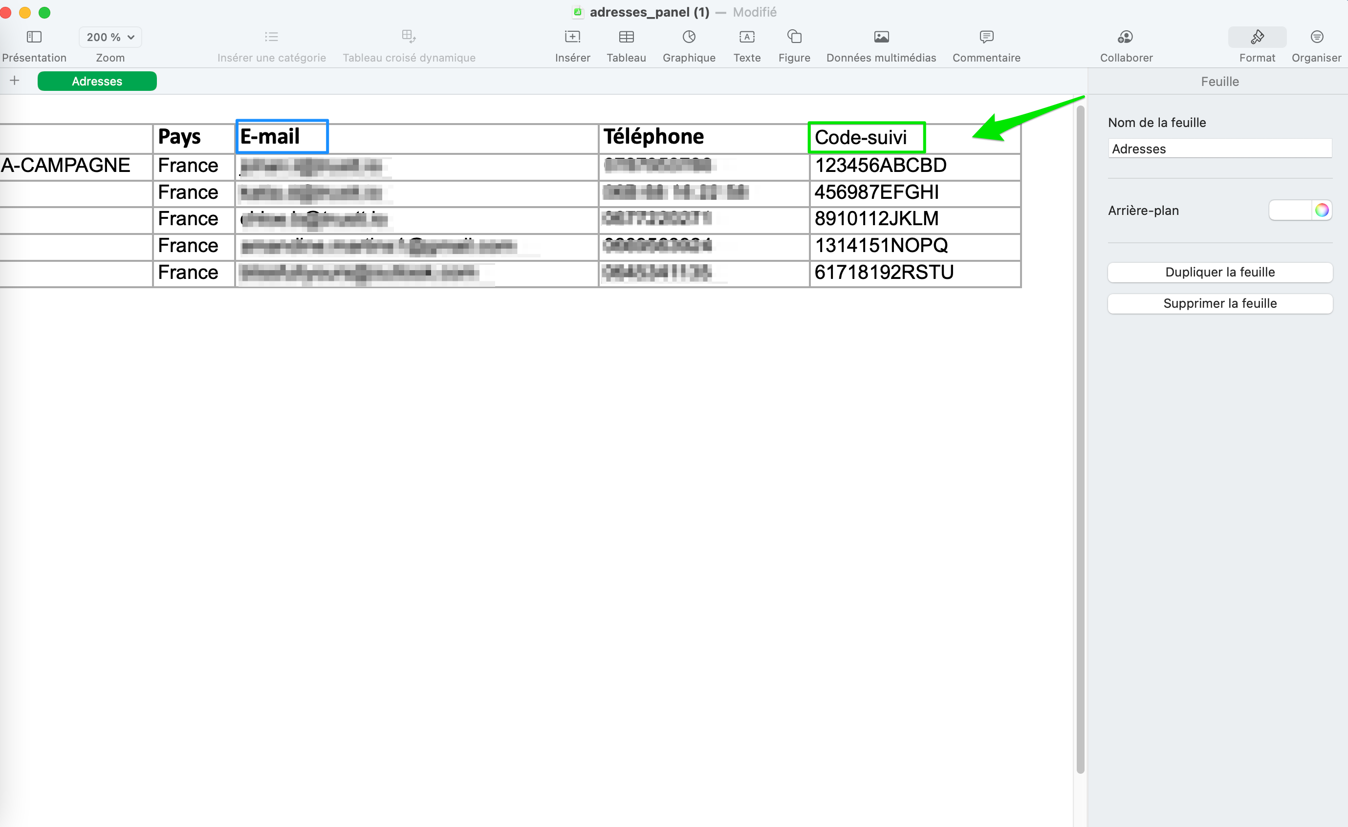 Ouvrir le fichier "adresses_panel.xls" et ajouter une colonne. Le titre de la colonne importe peu, il faut par contre qu'il soit facilement identifiable. Ajouter ensuite pour chaque ambassadeur le numéro de suivi de colis qui lui est attribué.