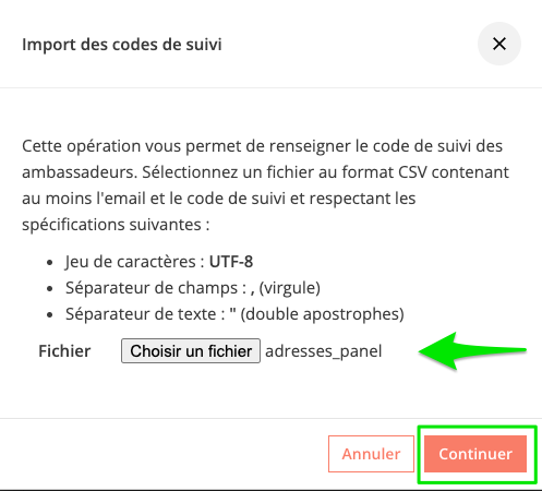 Cette fonctionnalité vous permet d'importer en un clic tous les codes de suivi pour le panel des ambassadeurs sélectionnés.
