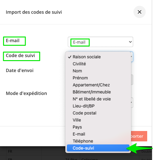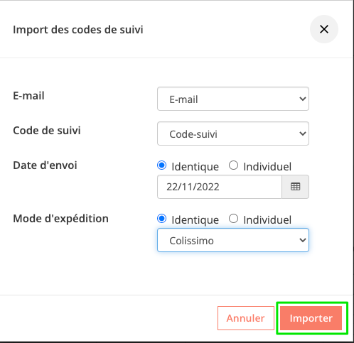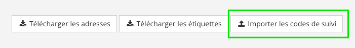 Cliquer sur le bouton Importer les codes de suivi et importer votre fichier au format CSV :