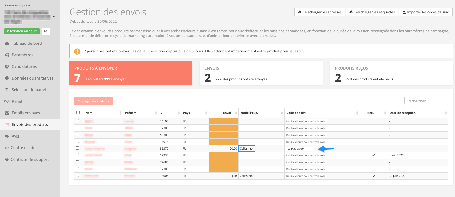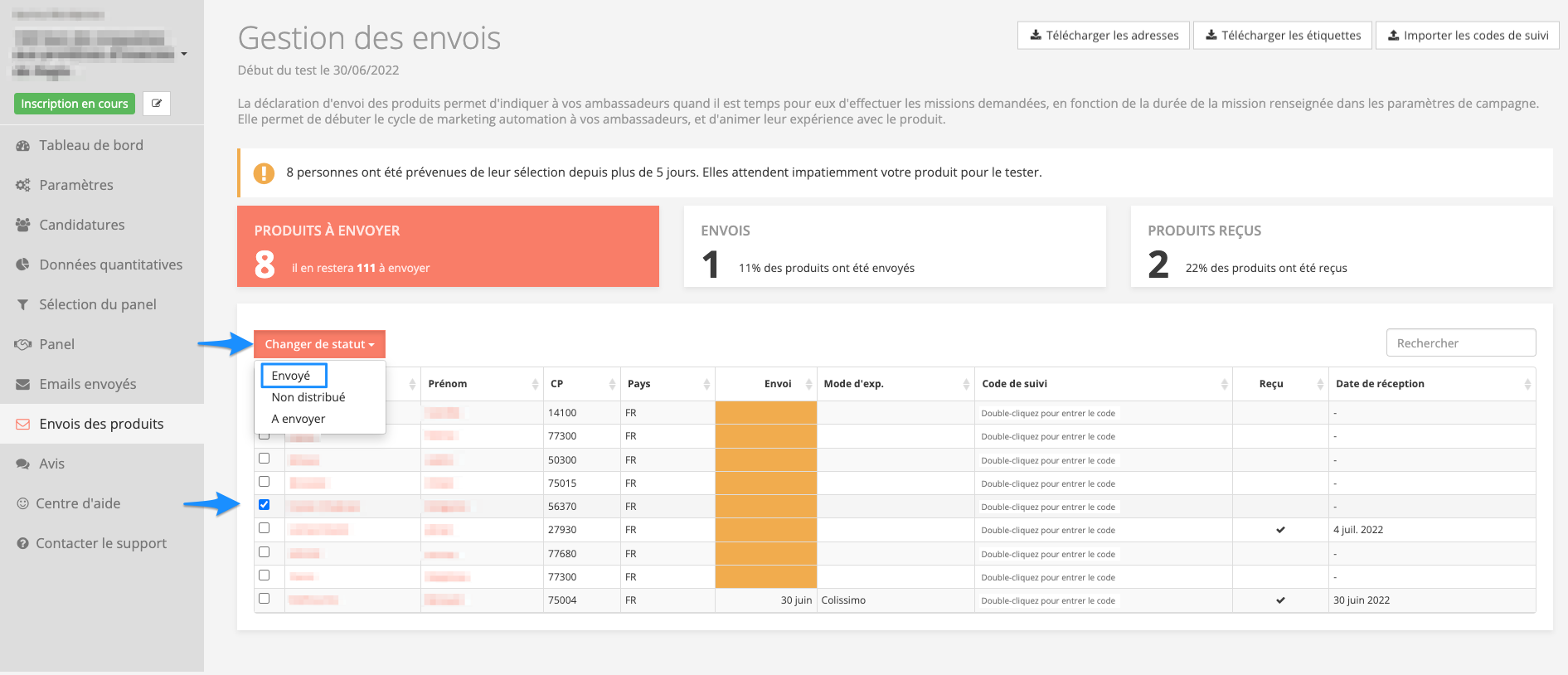 Une fois que votre panel ambassadeurs est effectué et validé, cliquez sur " Envois des produits" dans le menu latéral gauche de votre suivi de campagne. Sélectionner le ou les ambassadeurs à qui le produit n'est pas indiqué envoyé.