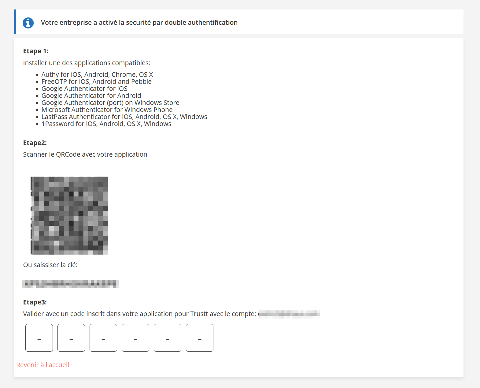 Vous saisissez manuellement la clé d’activation et l’application vous propose un code pour Trustt pour votre compte.