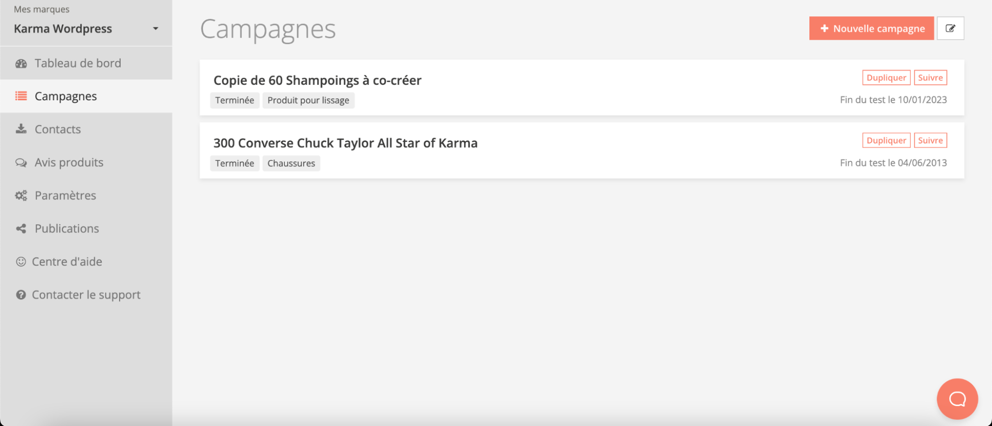 Une nouvelle campagne est alors créée. Il vous suffit de modifier les différents questionnaires et paramètres de campagne pour l’adapter au produit choisi pour votre nouvelle campagne.