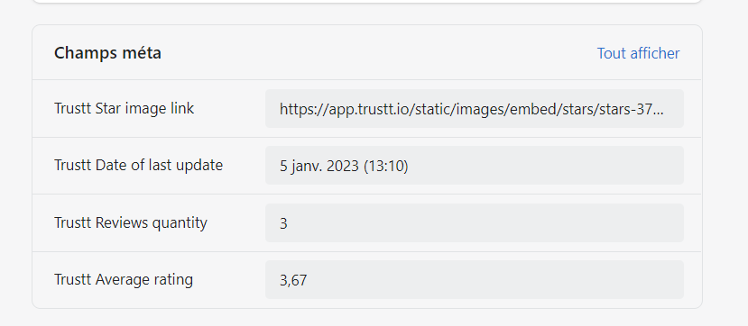 Si votre produit a des avis et que le nombre d’avis reste à 0, veuillez re-enregistrer le jeton d’API dans Trustt pour relancer la synchronisation des données produits