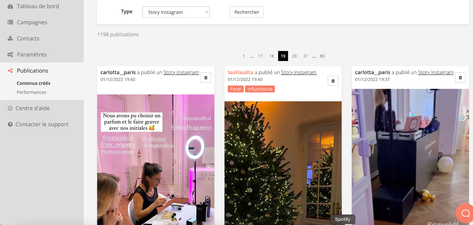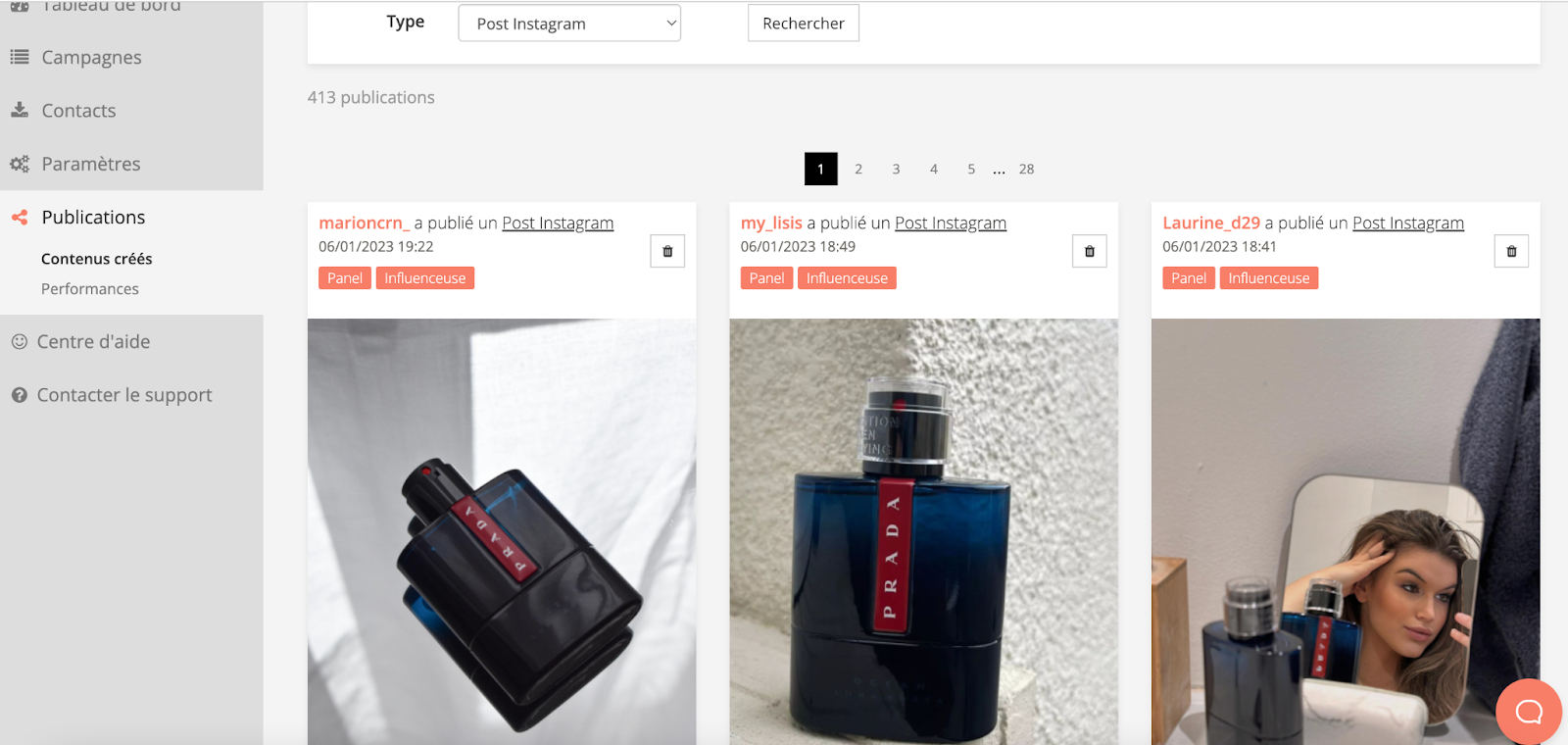 Vous pouvez retrouver toutes les publications sur les réseaux sociaux dans l’onglet “publications” puis “contenus créés”. Vous pouvez ensuite choisir le type de publication.