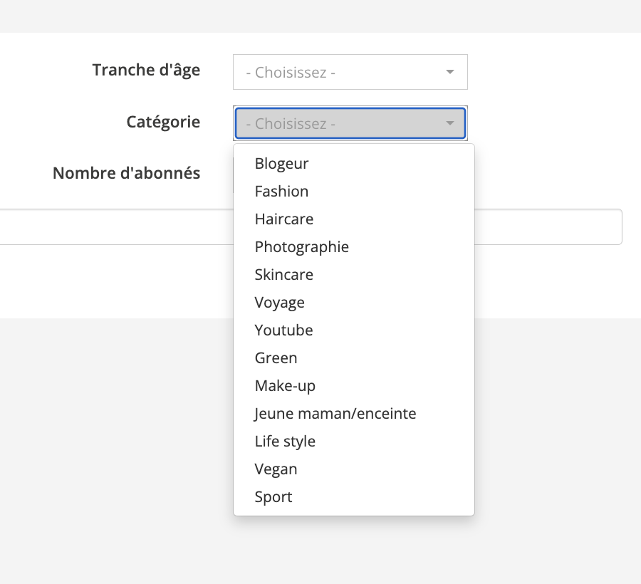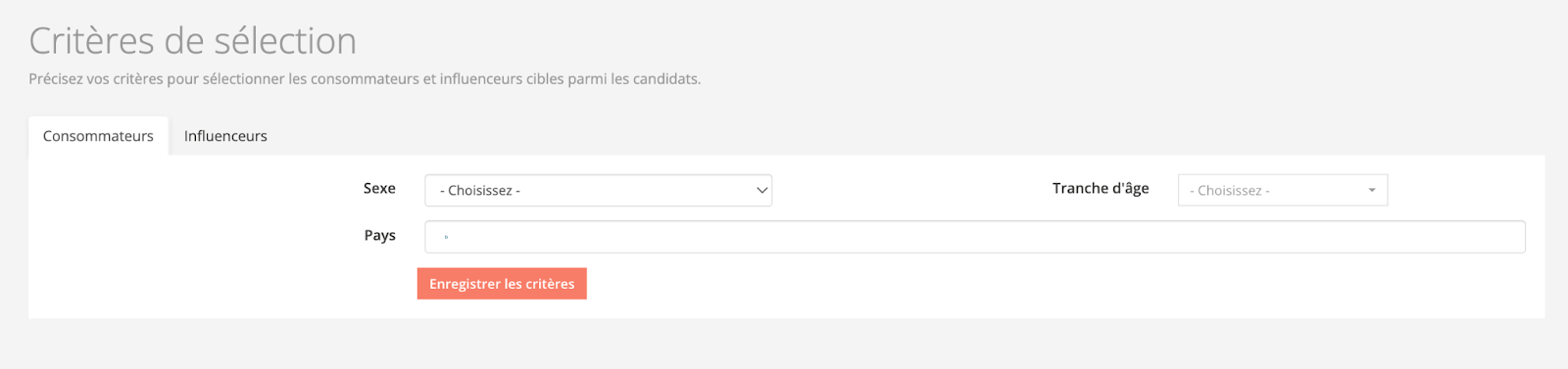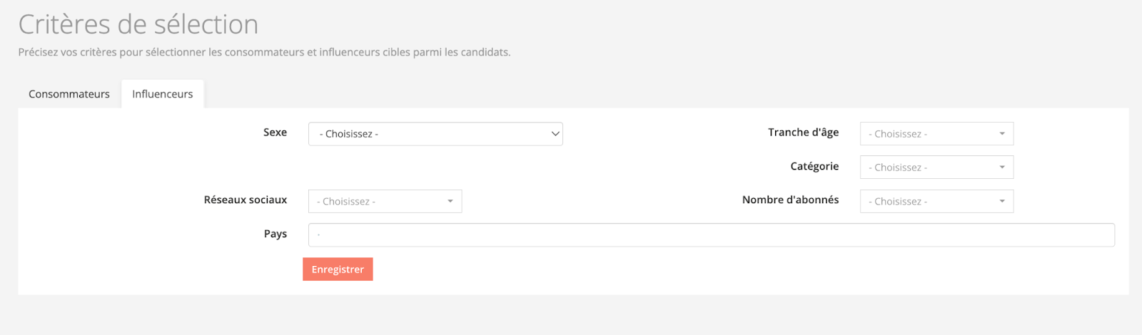 Les critères de sélection vous donnent la possibilité de filtrer par la suite les candidats selon différentes données selon s’il s’agit d’ambassadeurs ou de créateurs de contenus.