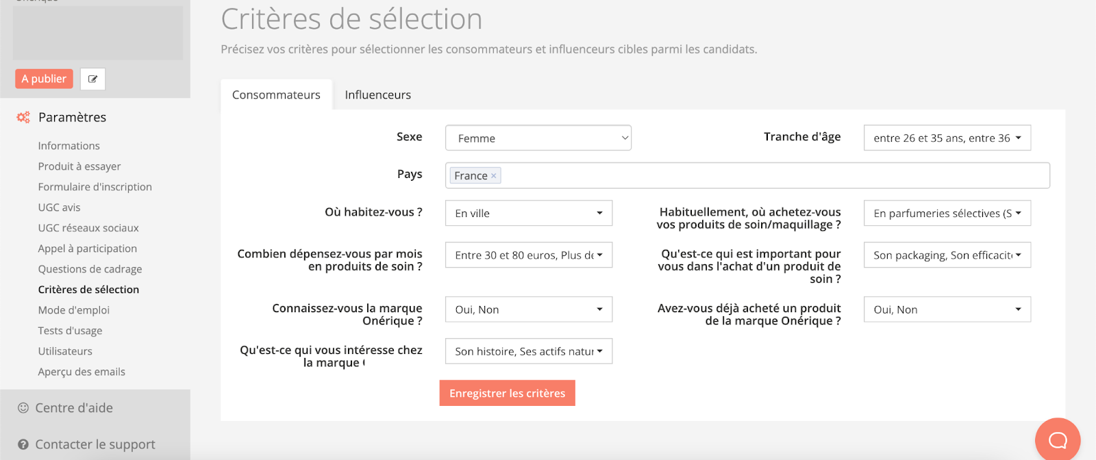 Pour choisir les meilleurs consommateurs et créateurs de contenus qui correspondent à votre cible idéale, définissez au mieux vos critères de sélection. Vous retrouvez ici les questions que vous avez choisi dans la partie "questions de cadrages".