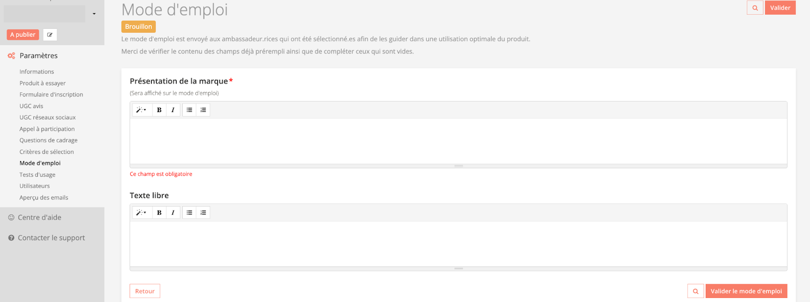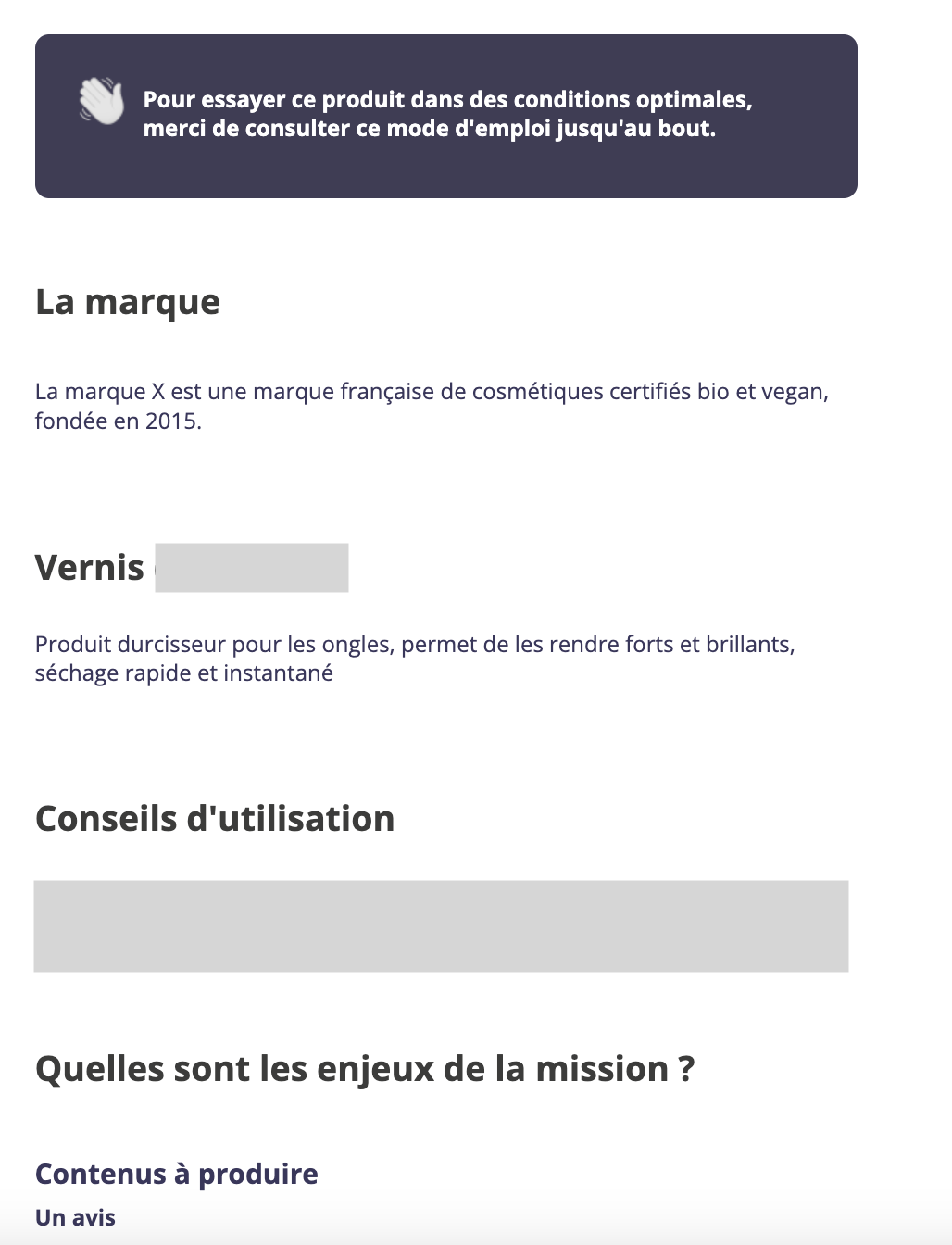 Le mode d’emploi est envoyé aux ambassadeurs et/ou créateurs de contenus sélectionnés par mail automatique depuis le logiciel. Il permet de les guider dans une utilisation optimale du produit, mais aussi de rappeler les étapes et les règles de la mission (contenus à produire, dépôt d’avis authentique, revente du produit interdite, etc).