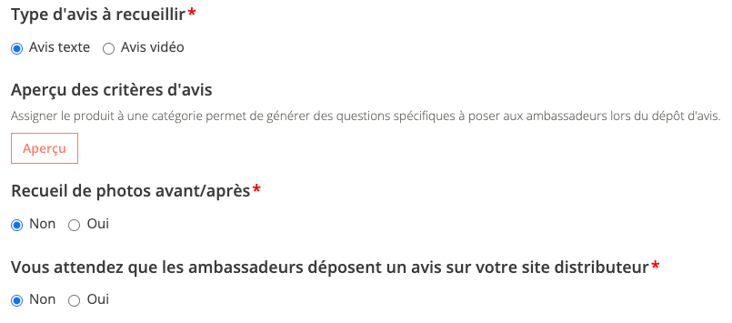 Si votre produit est catégorisé, des critères d'avis spécifiques au produit seront demandés lors du dépôt d'avis.