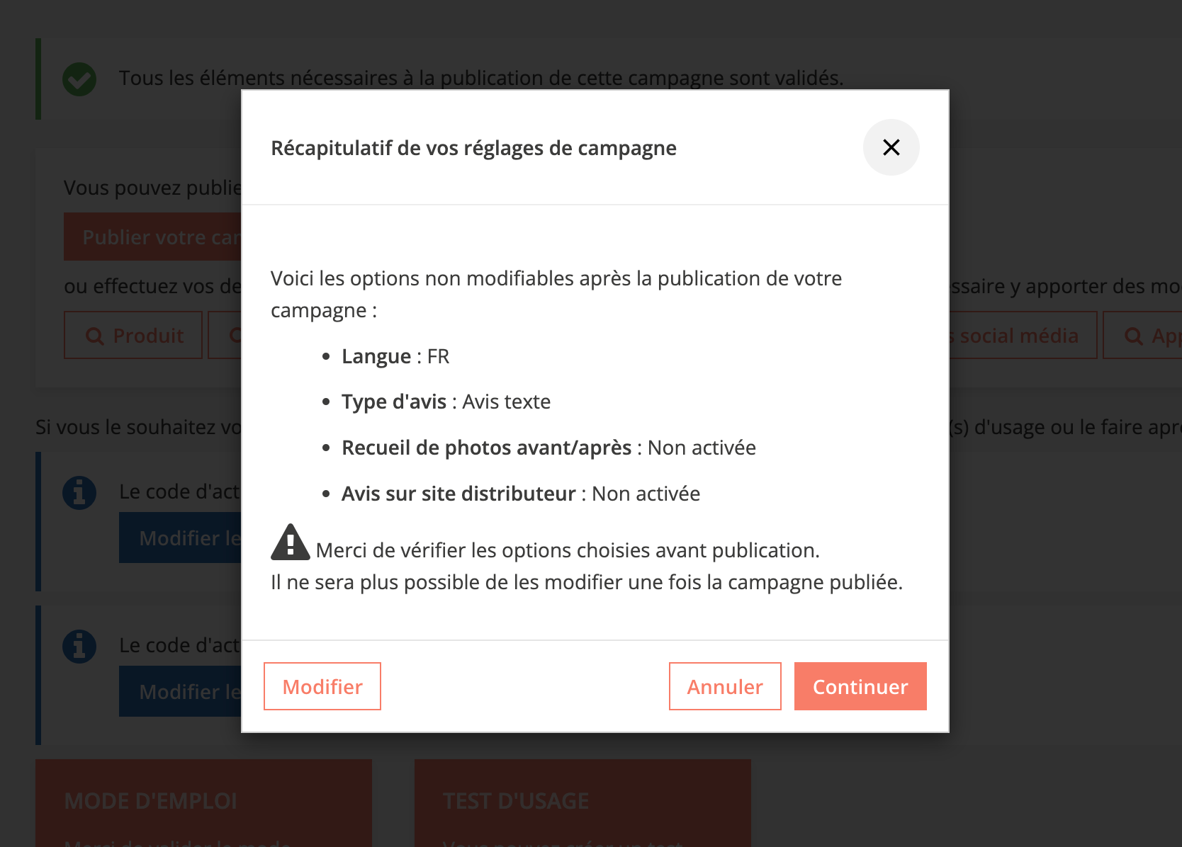 Les options de campagnes choisies sont rappelées pour une ultime vérification. Prenez le temps de bien les vérifier avant de continuer.