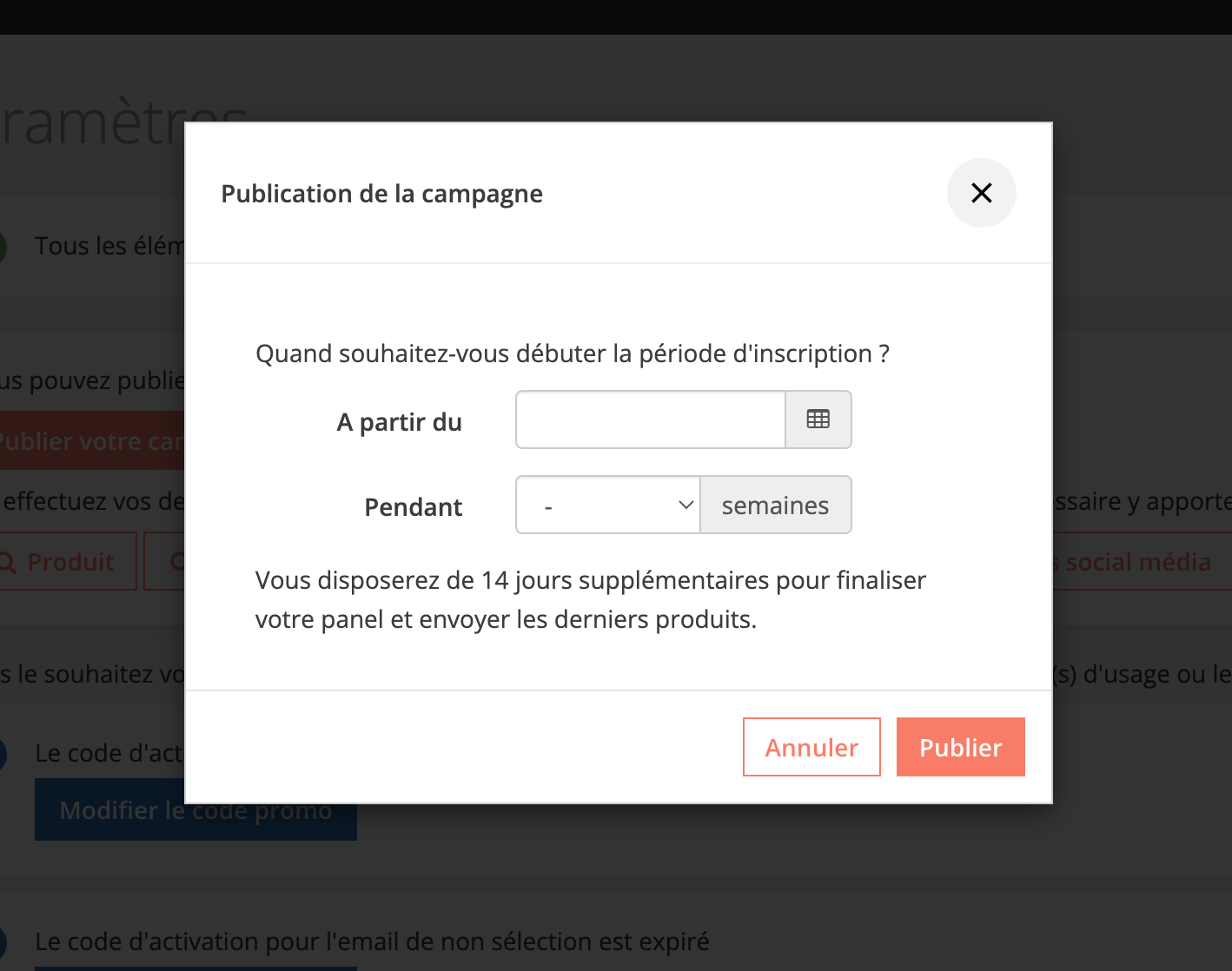 Il vous est alors demandé de choisir à quelle date vous désirez commencer la période d’inscription au test, et la durée de cette période d’inscription :Il est recommandé de laisser une période moyenne entre 15 jours et 1 mois pour collecter le maximum de candidatures et de data.