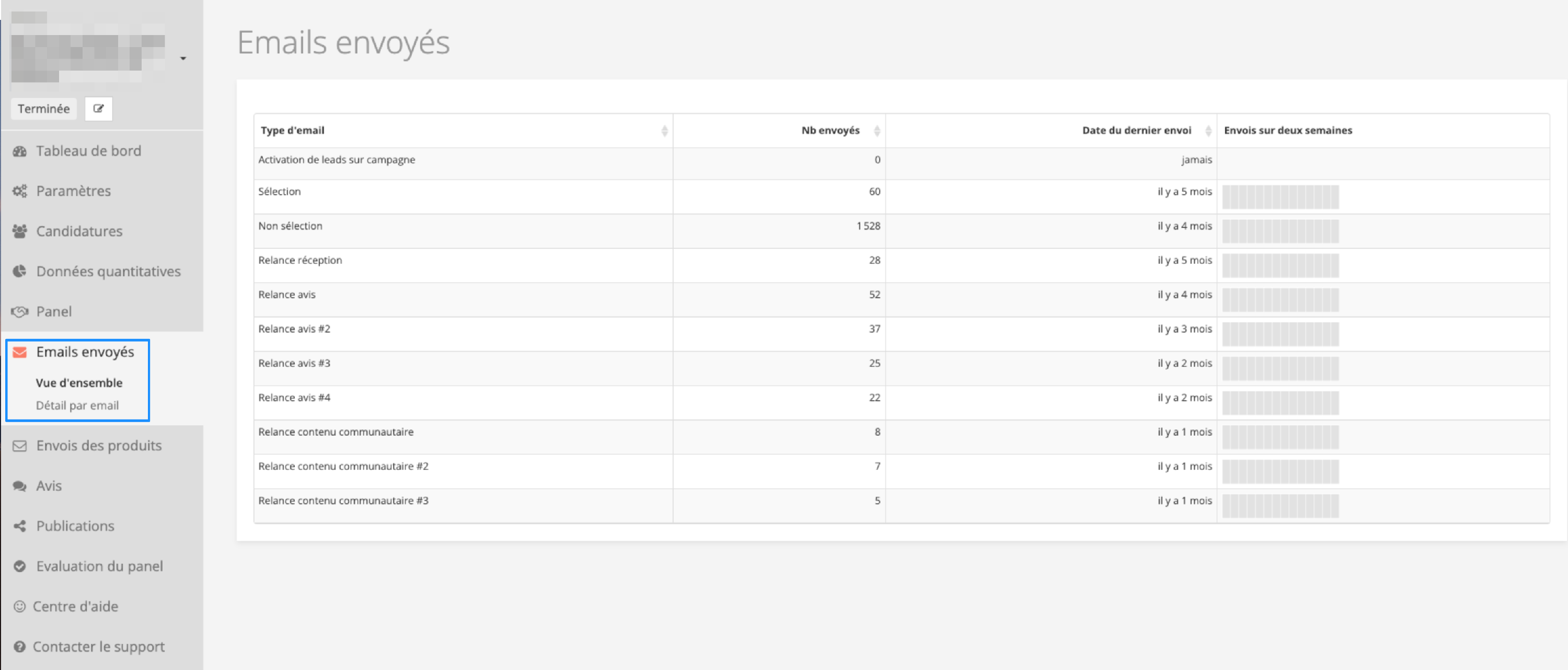 Dans la vue d'ensemble, vous avez le nombre total d'emails envoyés (par type d'email - qui correspondent aux étapes d'avancement de la campagne) et la date d'envoi.