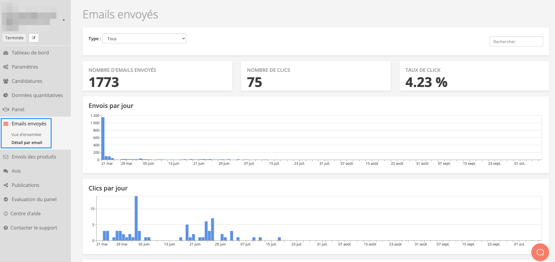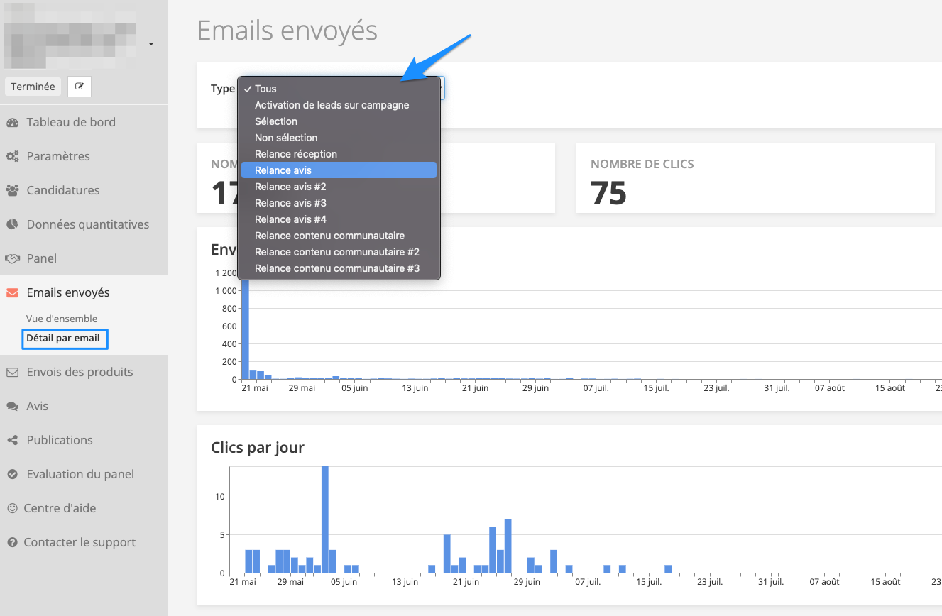 Pour connaitre les détails pour un type d'email, cliquer dans le menu latéral gauche, "Détail par email", puis sélectionner dans le champ "Type" l'email que vous souhaiter analyser.
