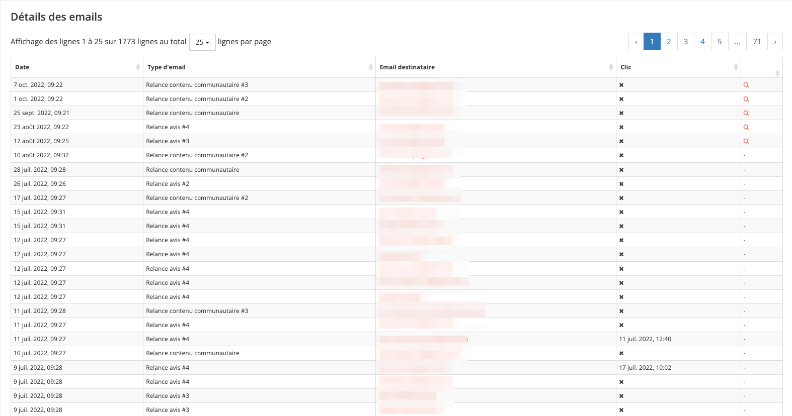 Ici, le tableau vous permet de cibler par email ambassadeur les interactions avec le type d'emails sélectionné.